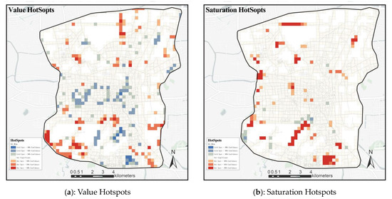 Figure 10 shows a hotspot analysis of the distribution of brightness and saturation in urban spaces to intuitively display the areas of extreme value aggregation of saturation and brightness within the research area. Based on this, the relationship between the areas of extreme value aggregation of brightness, saturation, and emotional perception in the city is explored.