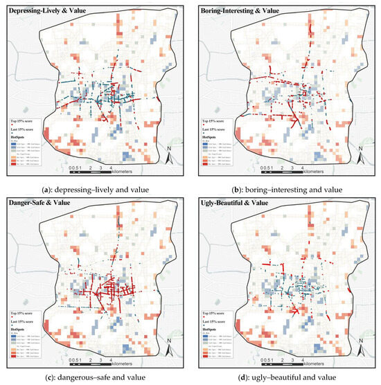 Figure 11 exemplifies this with an analysis of hot and cold spots in terms of brightness, where streets with the highest 15% and lowest 15% perceptual scores have significant overlap with the extreme value clusters, with the exception of the poverty–wealthy dimension. Specifically, points with a higher interesting score align to some extent with areas of higher brightness, suggesting that a continuous distribution of high-brightness colors can engage the interest of residents; points with a lower beautiful score and lively score overlap with areas of lower value, indicating that regulating value can improve color perception in these dimensions; points with a higher safe score overlap with areas of lower value, whereas points with lower scores overlap with areas of higher value, proving an inverse relationship between value and the perception of safety. Hence, by inversely regulating value, the perceptual experience in the safety dimension of some specific urban external spaces can be improved.