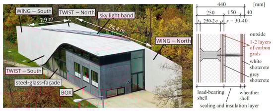 In September 2022, the carbon concrete composite (C3) demonstration house “CUBE” was opened in Dresden. It is the world’s first building to incorporate exclusively non-metallic reinforcements, mainly made of carbon fibres, to demonstrate their potential for creating slender, concrete-reduced, and aesthetically sophisticated structures [,,]. A special feature of the CUBE building is the two TWIST shells that extend from the horizontal walls to the vertical ceiling [,]. They consist of a carbon-reinforced concrete (CRC) load-bearing inner shell, waterproofing and insulation layers, and a CRC weather shell [,]. The TWIST elements are designed in such a way that they are sufficiently load-bearing, serviceable, and durable. Especially for the roof cladding exposed to the weather. It was therefore important to investigate the CRC in terms of its deformation behaviour and tendency to tear. Figure 1, left, shows the building with the two 24.4 m long, up to approximately 7.9 m wide, and 440 mm thick TWIST shells and the simplified cross-sectional structure (Figure 1, right). Every TWIST element also extends beyond the building to form an 8 m long wing. It is only 60 mm thick at the wingtip.