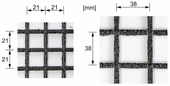 The epoxy resin impregnated carbon grids Q85 and Q95 from solidian GmbH, Albstadt, Germany with the two different impregnations E1 and E2 were used for these investigations [,]. According to the manufacturer, there is no difference in the effect of E1 and E2 on the mechanical properties of the reinforcements. The grids were embedded in two different fine-grained concretes. By varying different parameters of the reinforcement (number of layers, mesh size, and surface treatment by sanding), the influence of these on the crack width and spacing occurring in the concrete was to be determined. The following textile grids and concretes were used: