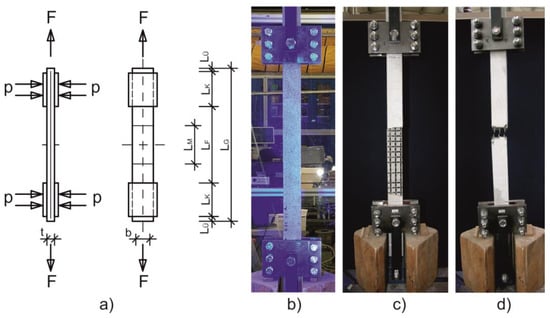 (a) Schematic testing setup; (b) Q85-test specimen in test rig with DIC, (c) delamination failure of a Q85-specimen, series A; (d) tensile failure of a Q85-specimen, series B; photos: Michael Frenzel.