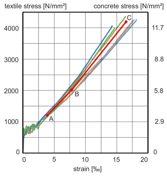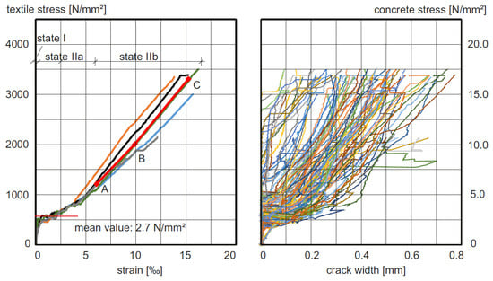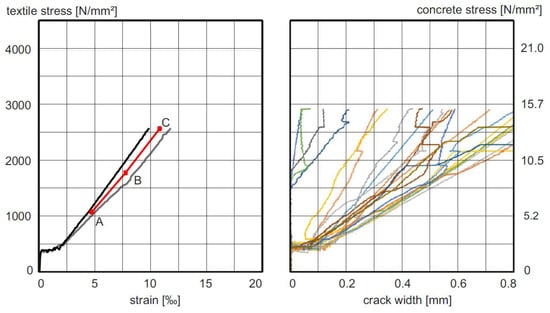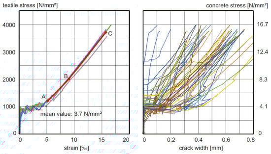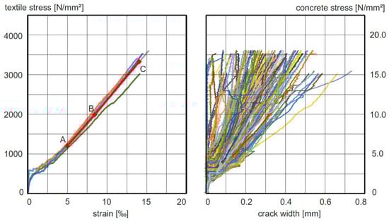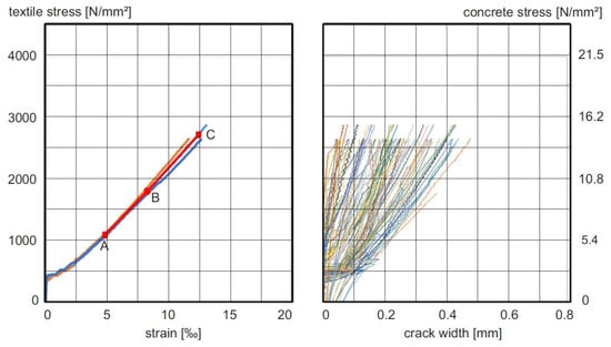 Figure 4, Figure 5, Figure 6, Figure 7, Figure 8 and Figure 9 show the stress–strain curves of the individual test specimens for series A to F and the measured crack openings for series A to E. For this purpose, the measured tensile forces were related to the textile area (textile stress) and to the concrete gross area (concrete stress). The roving cross-sectional area Atex for the Q85 series A, B, E, and F is 1.81 mm2 and for the Q95 series C and D 3.62 mm2. The concrete gross area is calculated from the existing specimen widths and thicknesses (bprov and tprov), Table 3. The strain of the specimen was obtained from the change in length of the 300 mm long centrally arranged measuring distance LM (Figure 3). The following results and findings were obtained: