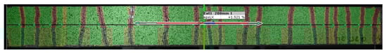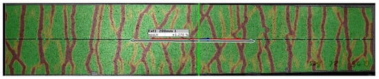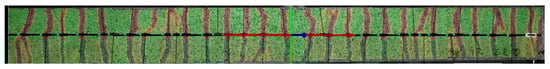 Figure 4, Figure 5, Figure 6, Figure 7 and Figure 8 show the widths of all detected cracks along the 300 mm measurement range for each series as a function of textile or concrete stress. In addition, Figure 10, Figure 11, Figure 12 and Figure 13 show exemplary DIC images of specimens from series A to D with their crack distributions. This allows the effect of the grid-sanding on the crack spacing and the number of cracks to be seen very clearly. The crack spacing decreases significantly for both Q85 and Q95 grids, resulting in an increase in the number of cracks. Table 5 summarizes the mean and maximum crack widths measured in the centre axis of the tensile specimen at a textile stress σtex of 1000 N/mm2 and 1500 N/mm2 respectively, and the mean crack spacing for series A through D. For better comparability, the percentage difference between each series is also shown. Series A is used as a reference and is thus set at 100%. The evaluation was carried out under textile stresses of 1000 N/mm2 or 1500 N/mm2, as mathematical estimates showed that the grids embedded in the CUBE roof would experience stresses in this range under service load.