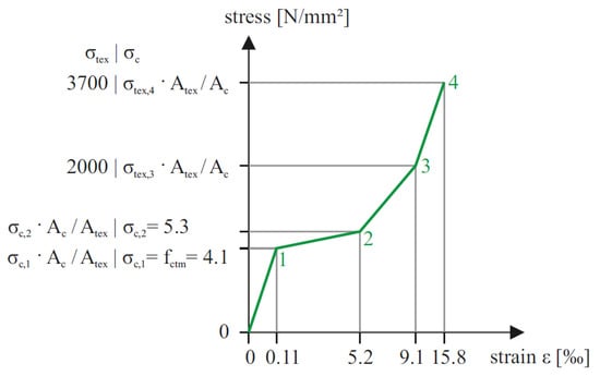 The material characteristic curve is shown in such a way that either the textile stresses σtex or the concrete tensile stresses σc are indicated on the ordinate. When creating the curve, the reinforcement area Atex and concrete gross area Ac must be taken into account accordingly. It should be noted that in the final building design, an ultimate stress of 3600 N/mm2 instead of 3700 N/mm2 was applied, see [].