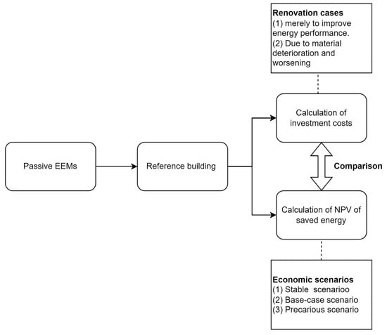 The cost effectiveness of each individual EEM is analyzed under each economic scenario assuming the above two renovation cases. If all the options of that EEM are cost-effective, a marginal cost-effectiveness analysis is performed to determine the optimal option. Then, the most cost-optimal options of EEMs are combined in packages according to the considered economic scenario. Figure 1 shows an overview of the approach followed in this analysis.