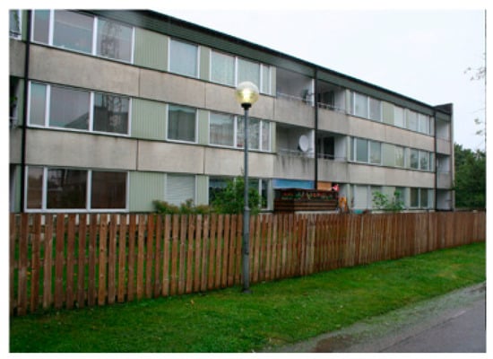 Approximately half of the multi-apartment buildings constructed under the Million Program encompasses three-story slab blocks []. These buildings were constructed in neighborhoods with at least ten buildings of the same sort. These buildings were constructed based on the technical and architectural ideas prevailing during this period, and the form is strictly geometrical with plain undecorated façades. This geometric character is emphasized by the vertical jams of balconies or the horizontal contours of windows. Entrances are usually located at a certain offset distance to the façade line to avoid rainwater from entering. Furthermore, the roof elements are mostly flat or exhibit low inclination.