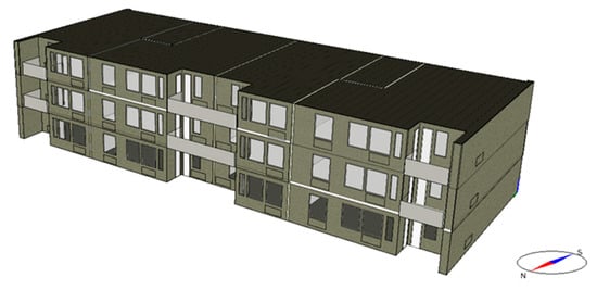 Our case study is a typical three-story multi-apartment building built in 1965 under the Million Program. It represents approximately 70% of the existing building stock in Sweden and other European countries []. The unique characteristics of these buildings including their construction technology and building technical systems make the renovation process challenging. This building is located in Växjö, Sweden (latitude 56°88′ N, longitude 14°81′ E) which belongs to a warm temperate climate zone according to the Köppen–Gieger classification []. Figure 2 shows a picture of the analyzed building. This concrete frame building consists of 12 housing units with a total heated area and a ventilated volume of 1223 m2 and 3173 m3, respectively. Currently, this building is heated by the local district heating system. Space heating is fulfilled through waterborne radiators, which is a typical configuration in these multi-apartment buildings. Ventilation is currently based on a mechanical exhaust system maintaining a constant air flow rate of 0.35 l/s m2. Table 6 lists the areas and thermal transmittance values (U-values) of the building envelope elements.
