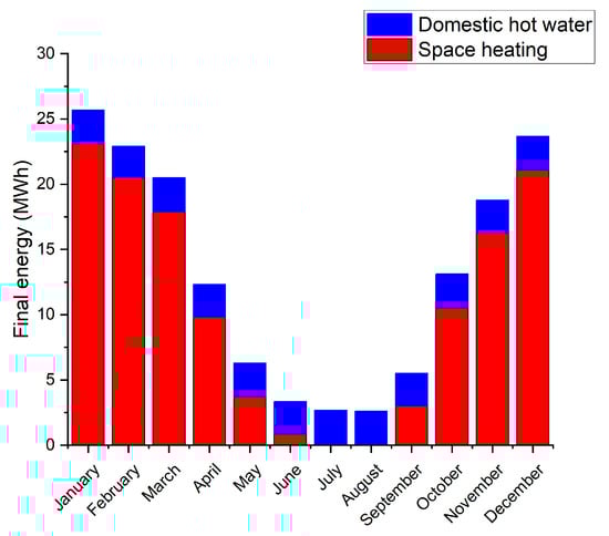The building in its initial state exhibited annual final energy demands for space heating, domestic hot water (DHW) heating, and facility electricity of 103.7, 25.1, and 5.1 kWh/m2, respectively. Figure 4 shows the monthly delivered final energy for space and DHW heating before the EEM implementation.