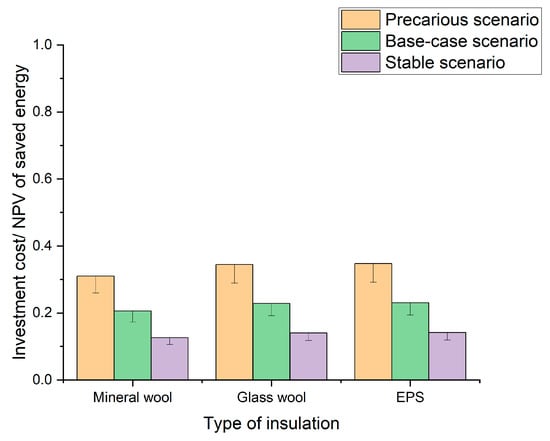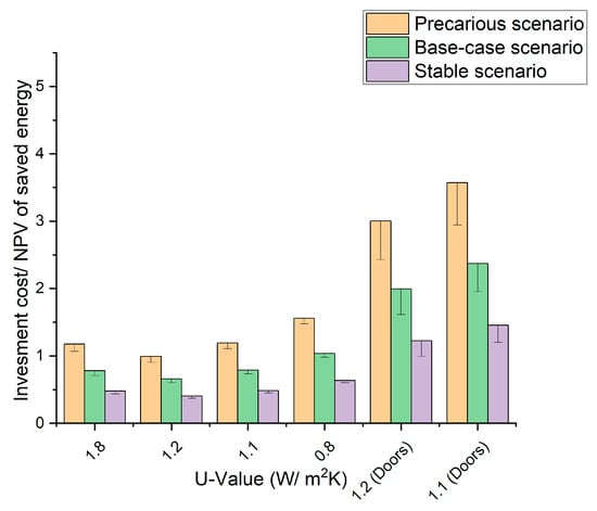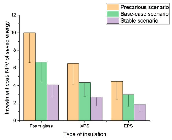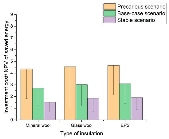Figure 5, Figure 6 and Figure 7 show values of the lowest ratio of the investment costs to the NPV of the total energy savings for the different types and thicknesses of insulation materials applied to the roof, exterior walls, and ground floor. Figure 8 shows values of the lowest ratio of the investment costs to the NPV of the total energy savings for the different types of windows and doors. The error bars indicate the ratio values when assuming the need to renovate due material deterioration and worsening.