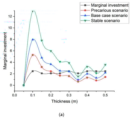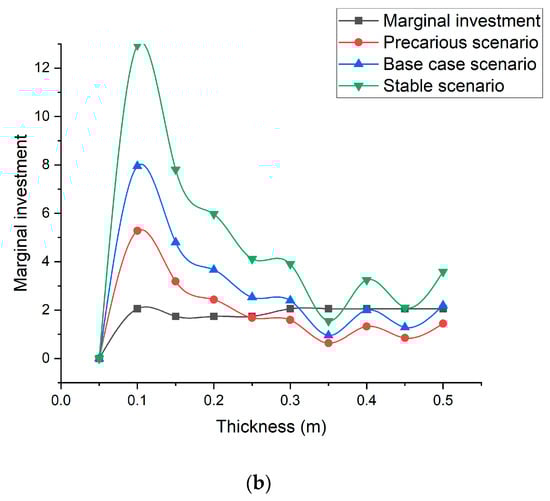 Figure 9a shows that the optimal glass wool thickness under the base-case, stable, and precarious scenarios is 300, 500, and 200 mm, respectively, when assuming renovation to merely improve the energy performance. This indicates that, under the base-case scenario, selecting a thickness larger than 450 mm will yield a lower marginal NPV of energy savings than the marginal investment cost. Hence, it is more viable to apply a thickness of 450 mm than 500 mm. When assuming the renovation due to material deterioration, the optimal glass wool thickness under the base-case, stable, and precarious scenarios is 500, 500, and 300, respectively.