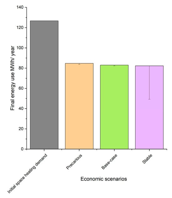 The figure shows that the highest final energy savings achieved for space heating occurred under the stable economic scenario and considering the need to replace certain parts due to material deterioration and worsening. Under this economic scenario and material deterioration-related renovation case, it was possible to apply EEMs to all the building envelope elements while realizing cost effectiveness. The annual space heating demand was reduced by approximately 61% below the initial demand. Where an annual space heating demand of 49.2 kWh/m2 was achieved. Under the other economic scenarios and renovation cases, the final energy savings reached an average value of 37.6 MWh/year.