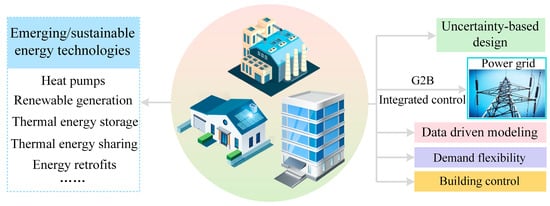 To achieve NZEBs, a range of energy-efficient solutions and technologies are often needed, which should offer increased energy efficiency and improved demand flexibility. To further support achieving the global decarbonization goals within the built environment, this study aims to explore advances in several emerging and sustainable technologies (Figure 2) for building energy savings and carbon emissions mitigation to enhance building sustainability. The key elements of each strategy and technology are also highlighted, along with the benefits reported in the available literature. It is worthwhile to note that the selection of these emerging and sustainable technologies was based on several key factors and considerations, such as technology maturity, market availability, interoperability, scalability, applicability, long-term viability, and most importantly, carbon reduction and energy reduction potential. Moreover, a systematic approach was adopted to review these technologies by first summarizing the importance of near-optimal sizing of building energy systems using uncertainty-based design. Emerging and sustainable technologies and strategies, along with control schemes, were then discussed, and lastly, grid-buildings integrated control was summarized for decarbonization of the building sector while supporting dynamic supply conditions of renewable-integrated grids.