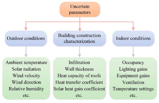 With the wide deployment of distributed renewable energy generation, the energy systems in buildings are characterized by uncertainties. Discrepancies are always found between the expected performance and field observation due to uncertainties from different factors such as weather conditions and occupancy behaviors [,,]. These uncertain parameters could be categorized into three different groups [,], including outdoor conditions, building construction characterization, and indoor conditions, as shown in Figure 3. These uncertainties directly affect the estimation of both energy demand and generation []. Due to the lack of systematic consideration of the impact of uncertainties, inappropriate system configuration could occur in engineering applications []. To mitigate this issue, uncertainties should be carefully considered in designing and sizing building energy systems, in particular for NZEBs. Generally, the uncertainty-based design of building energy systems consists of three steps: (1) uncertainty characterization; (2) performance assessment under uncertainties, and (3) multi-objective decision-making. The uncertainty characterization includes the identification of uncertain parameters and the qualification of identified uncertainties. Subsequently, simulations are needed to evaluate the performance of the developed system models under uncertain conditions, enabling the generation of a Pareto solution set based on multiple objectives, such as life cycle costs, energy efficiency, environmental influence, and thermal comfort. The final step involves a comprehensive evaluation and comparison of different design alternatives. The optimal design solution should be determined according to the predefined objectives and alignment of the goals and requirements of stakeholders.