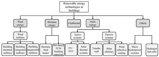 Renewable energy is a key solution for climate change and building decarbonization. In the roadmap developed by the International Renewable Energy Agency (IRENA), it was suggested that renewables can make up to 60% or more of many countries’ total final energy consumption in 2050 []. As shown in Figure 4, different renewable energy technologies can be integrated with buildings to meet electricity and heating and cooling demands. Among different technologies, solar energy holds paramount importance due to its abundance and versatility. Its widespread application has been facilitated by favorable policies, significantly reducing the implementation costs of photovoltaic (PV) panels from 4.6 cents/kWh in 2021 to 2 cents/kWh in 2030 []. The diversification of solar energy applications has evolved from active to passive technologies. PV systems, prevalent in mitigating power supply pollution, are anticipated to constitute over half of the total renewable energy electricity generation by 2050 []. The share of distributed PV generation is continuously increasing. For instance, in 2021, China’s distributed PV capacity was 108,580 MW, whereas it was 17,037, 48,559, 48,292, and 42,677 MW for Australia, Germany, Japan, and the United States, respectively. All these countries also have a high capacity for centralized PV generation []. PV and photovoltaic/thermal (PVT) systems can be integrated into diverse building elements, including roofs, atriums, skylights, ventilated facades, double-skin facades, and window curtains. Hybrid solar systems that combine active and passive technologies, such as Trombe walls combined with PVs, solar chimneys paired with PVs or phase change materials (PCMs), and PV-integrated ventilation blinds, have also been studied []. Although wind energy typically requires expansive open spaces and distance from urban areas, the proliferation of tall buildings in densely populated urban settings has opened new opportunities. Properly spaced tall buildings can harness and transfer wind energy over short distances. Wind energy has the potential to fulfill around 10%–20% of urban tall building energy demand, and urban wind energy systems predominantly comprise wind turbines, typically ranging from 1 to 20 kW, placed on buildings and adjacent grounds []. However, careful consideration of local environmental conditions and urban boundary layers is essential for appropriate design and efficient deployment of wind energy systems []. Due to the limited initial exploration, many wind turbine projects failed to meet output expectations after a few years of operation []. Biomass energy, accounting for approximately 10% of global primary energy demand, represents a vital renewable energy source []. Biomass-fired heaters, in conjunction with heat pumps, can provide an economically viable solution for building heating needs. These heaters can cover up to 65% of space heating demand, effectively decreasing reliance on the grid and heat pumps []. Furthermore, biomass-derived porous carbon materials resulting from pyrolysis can serve as favorable supporting materials for shape-stabilized PCMs, exhibiting beneficial attributes such as micropore structure, chemical stability, and the potential for integration into construction materials like cement bricks/blocks []. There are other types of renewable energy, such as micro-hydro and hydrogen fuel cells, that have been tried in buildings. Micro-hydroelectric systems can harness the energy of flowing water to drive turbines, producing electricity, and are often employed by homeowners in remote areas. While the utilization of hydrogen energy in buildings has not yet been widespread, it is being investigated as a potential means of decarbonizing heating and cooling in buildings. The prevalent approach involves fuel cells, which can generate both electricity and heat for buildings. It is still in its infancy stage, with ongoing projects to explore its potential []. However, the adoption of hydrogen energy in buildings faces challenges such as high production costs, limited infrastructure, and safety concerns associated with handling hydrogen, which restricts its widespread integration in buildings [].