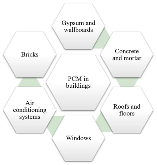Sensible and latent energy storage systems are the two major TES systems used in buildings. Sensible energy storage systems require large volumes compared with that of latent energy storage systems. However, currently, sensible energy storage systems in the form of hot water tanks are among the most used TES systems in buildings because of their low cost and low complexities []. Research has shown that latent energy storage systems are more effective than sensible energy storage systems, and they can be used in different ways to enhance the overall thermal performance of buildings and building energy systems. Phase change materials (PCMs) have demonstrated high performance and practicality to be used as the leading latent energy storage medium in building applications. Figure 5 illustrates different applications of PCMs in buildings, where PCMs can be integrated with building envelope and building energy systems for enhanced performance.