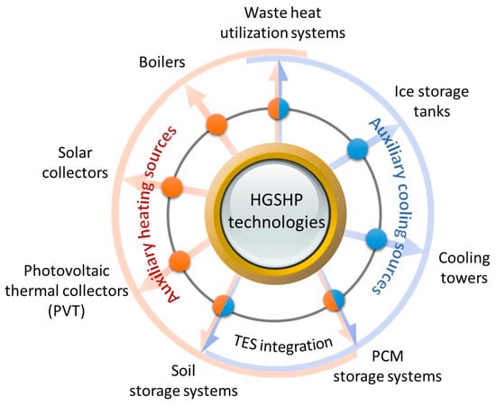 Among different heat pump technologies, ground-source heat pump (GSHP) systems are receiving increasing attention [,] as they can take advantage of the relatively stable earth temperature to achieve heat extraction from or heat rejection to the ground through ground heat exchangers to meet different air-conditioning requirements. The long-term operation of stand-alone GSHP systems may lead to ground thermal imbalance, resulting in system performance degradation []. Hybrid GSHP systems assisted with supplementary devices have been considered to be a solution to alleviate soil and system performance deterioration []. In addition to environmental and energy performance improvements brought by the application of auxiliary devices, obvious economic benefits can also be achieved, especially in terms of cost savings in the upfront purchase and installation of ground heat exchangers [,]. As shown in Figure 6, different auxiliary devices can be coupled with GSHP systems [] to increase the overall efficiency and mitigate ground thermal imbalance.