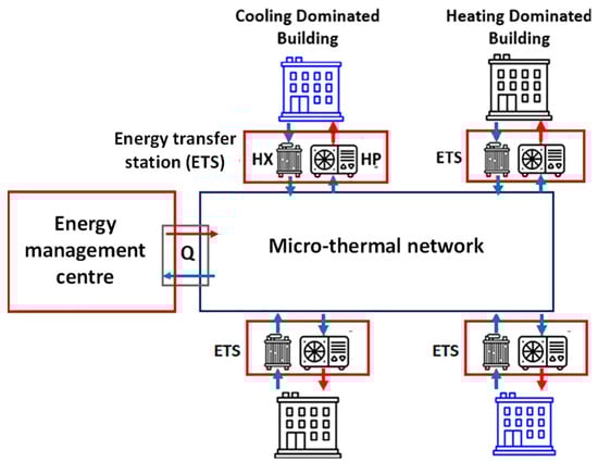 Illustration of a thermal energy sharing system, where HX represents the heat exchanger, and HP indicates the heat pump [].