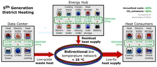 One notable utilization of waste heat is to supply thermal energy for heating purposes, such as integrating with district heating (DH) networks [,] and preheating swimming pools [,]. Recent studies have demonstrated the potential benefits of thermal energy sharing systems. Pan et al. [] examined the performance of an adsorption chiller, which was powered by thermal energy recovered from a data center. Araya et al. [] presented a lab-scale Organic Rankine Cycle (ORC) system, which was designed to operate using low-grade waste heat obtained from a server rack within a data center. Abdalla et al. [] introduced a reduced model of a thermal energy sharing system, which effectively allowed thermal energy to be shared among different facilities. It was found that such a system could fulfill 48% of the overall heating demand, and by incorporating a water tank, an additional 12% of thermal energy could be covered, resulting in a remarkable 74% reduction in total carbon emissions. In another study by Wirtz et al. [], an optimal design approach based on Linear Programming was developed for the design of the 5th-generation district heating system, as shown in Figure 8. It was found that the optimized system achieved a remarkable 42% cost reduction and an impressive 56% decrease in carbon emissions through component selection and optimal sizing. Similarly, a study described in [] focused on thermal energy sharing between the cooling system of a data center and a multi-unit residential building. The findings indicated that energy sharing reduced the heating requirements of the building by 55% and the cooling requirements of the data center by 50%. Zhang et al. [] developed an economic evaluation model for waste heat utilization of data centers in district heating networks. It was reported that reusing waste heat from data centers could achieve both economic and environmental benefits. Li et al. [] examined two thermal energy storage methods in thermal energy sharing systems, including short-term storage using a water tank and long-term storage using a borehole thermal energy storage system. The water tank was found to effectively reduce peak loads by 31% and lower annual energy costs by 5%, and the borehole system can increase waste heat utilization from 77% to 96% and achieve an annual reduction of 8% in CO2 emissions. By dynamically optimizing the parameters of the water tank, an optimal storage size was determined by considering the trade-off between the payback period and heating cost savings. It was found that prosumers could save up to 9% of their annual heating costs []. Wang et al. [] proposed an efficient system using CO2 direction-expansion GSHPs to harvest the waste heat from a data center for heating surrounding buildings. It was found that this system could reduce energy consumption by nearly 50% when compared to air-source heat pumps.