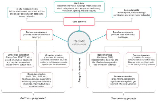 In the past, the selection and quantification of co-benefits of retrofit measures were often achieved with the assistance of energy auditing, building performance simulations, and domain expertise. With the continued development of low-cost sensors, massive data can be readily available from existing buildings, and this presents significant opportunities to use machine learning and big data analytics to optimize the retrofit process and explore energy-saving potential. Figure 10 summarizes different retrofit methodologies for large-scale building retrofits []. Based on the data collected from existing buildings, the bottom-up approach focuses on retrofitting individual buildings by analyzing different retrofit strategies and then extrapolates the results to larger scales, while the top-down approach focuses on using the available datasets to explore retrofit potential, establishing benchmarks, and providing guidelines for the development of energy retrofit policies [].