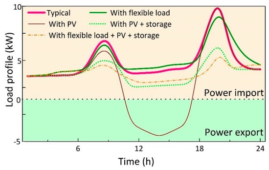 Demand flexibility of a building is its ability to manage its energy demand and generation based on user needs, grid requirements, and local climate conditions []. It can allow end-users to decrease, increase, modulate, or shift energy consumption to modify their load profiles using flexible load and/or onsite generation and storage sources, and is an attractive resource to provide grid support services and smooth out the so-called “duck curve” of power systems (Figure 12) while meeting interests and objectives of end-users such as energy availability, decreased energy costs, and reduced carbon emissions [].