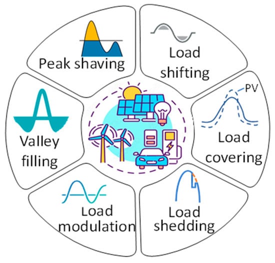Flexible demand is a viable component of “non-wires alternatives” and is a low-cost resource to effectively support power balance and accelerate renewables penetration in the energy mix. Demand flexibility in buildings can be greatly increased by using onsite generation, energy storage, and controllable loads, and can help reduce energy costs of end-users according to different flexibility types and demand management strategies (Figure 13) relating to flexibility capacity, duration, and response speed. By reducing and shifting the timing of electricity consumption in the grid-interactive efficient buildings, a 6% carbon emissions reduction in the US power sector can be achieved by 2030 []. The introduction of a Smart Readiness Indicator (SRI) to promote smart buildings with the capacity to provide demand flexibility and linking the SRI assessments to the Energy Performance Certificate in the building sector in Europe can result in final energy savings of up to 198 TWh by 2050 and 32 million tons of avoided carbon emissions per year []. A study for 498 residential homes showed that using battery and demand flexibility through home energy management systems along with energy efficiency upgrades can save households up to $590 in annual electricity costs [].