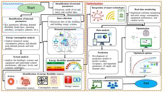 Figure 14 illustrates a general process to characterize and optimize demand flexibility in buildings. Characterizing and optimizing building demand flexibility involves a comprehensive analysis and enhancement of a building’s ability to dynamically adjust its energy consumption and generation patterns in response to external factors, grid conditions, and operational needs. It requires an in-depth understanding of a building’s energy systems, envelope, occupant behavior, and the potential for integrating renewable energy sources and energy storage systems. Characterization involves the collection and interpretation of data related to occupancy patterns, thermal performance, equipment efficiency, weather data, energy demand profiles, and potential integration of smart technologies []. This information helps identify opportunities for demand response, such as load shifting and peak shaving. It also involves the use of different technologies and solutions for enhanced demand flexibility along with the quantification of the achieved flexibility. For instance, the integration with smart grid technologies enables a building to respond to signals that incentivize energy conservation during peak demand periods or take advantage of surplus energy during off-peak hours []. Furthermore, the implementation of energy-efficient HVAC systems, smart lighting, and automated shading systems can contribute to improved demand flexibility by reducing overall energy consumption and improving indoor thermal comfort [,,]. Energy storage solutions, such as batteries or thermal storage systems, can play a crucial role in improving building demand flexibility through strategically managing stored energy, reducing their reliance on the grid during peak hours, and contributing to overall grid stability []. Characterization of demand management based on different sources and their potential benefits can help select optimal flexible systems for enhanced flexibility.