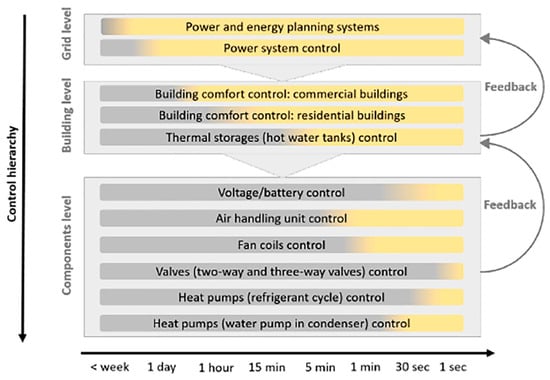 A wide range of computational and experimental aspects related to the integration of buildings into the grid have been the subject of numerous studies. Huo et al. [] proposed a two-level hybrid decentralized-centralized (HDC) strategy to control distributed energy resources in grid-interactive efficient buildings. This HDC algorithm can offer a scalable and bifurcated approach to managing a large number of grid-connected buildings and devices. The two-level design consisted of central aggregators that manage buildings and a system operator that coordinates the distribution network in a decentralized manner. Rastegarpour and Ferrarini [] analyzed different modeling and control techniques to address building energy efficiency and management problems. The importance of adaptive control techniques and real-time predictive models in optimizing energy usage and integrating buildings into smart grids was highlighted. Figure 15 shows the control hierarchy and levels of integration of building components to the grid over a time period ranging from a week to one second. The yellow zone shows the area where the system behaved dynamically.