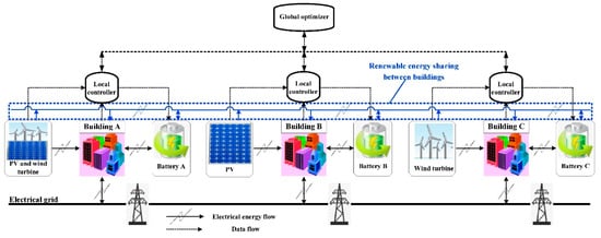 In addition to the integration with the bulk grid, building energy management strategies have also been established for microgrids [,,]. A management strategy for battery energy storage was proposed for commercial building microgrids, considering the operational costs and grid resilience. This strategy was able to increase the microgrid’s resilience while maintaining the operational cost at a low level []. A framework for smart transactive energy in residential microgrids was proposed in []. An existing home-microgrid coalition formation scenario was used to verify the viability of the proposed method. Based on the work in [], an enhanced transactive energy framework was further created to enable multiple residential microgrids to cooperate with each other by forming alliances in order to increase competitiveness []. In [], the supply of regulation services by smart buildings was examined. Price signals were exchanged between the grid and building operators to adjust building energy usage. Additional research on buildings-to-grid (B2G) integration showed that HVAC control in grid-aware buildings can provide frequency management or ancillary services to the grid while maintaining occupants’ thermal comfort to an adequate level. In [], the control actions of both the power grid and buildings were coupled to optimize the performance. An MPC-based algorithm was developed to formulate the B2G integration, accounting for the time-scale discrepancy. To solve the duck-curve challenges by reducing the load-ramp rate, a predictive bidirectional control framework was presented in [] for power flow control of B2G systems. Mirakhorli et al. [] proposed a unique load aggregation method that used model predictive controlled loads and integrated power generation, grid constraints, and human behavior in a large cluster of buildings. The proposed method improved the control over multiple appliances and storage systems by introducing a behavior-driven price-based MPC for residential building energy management systems. Extensive testing on a large distribution network showed significant reductions in nodal voltage drop and peak loads with a 21% reduction in generation costs. Fan et al. [] proposed a collaborative control optimization approach, as shown in Figure 16, for grid-connected NZEBs to improve their performance at the building group level. This approach used a game theoretic framework to coordinate the control of multiple NZEBs in order to maximize their overall performance. The results showed that the proposed approach can reduce peak demand, improve grid stability, and increase the utilization of renewable energy sources. Clastres et al. [] proposed a mathematical model for optimizing the operation of a domestic PV system to provide ancillary services to the electricity grid. The model considered the intermittent nature of solar generation, the cost of electricity, and the value of ancillary services. It was found that PV systems can provide significant ancillary services to the grid, such as frequency regulation and voltage control. This could lead to increased reliability of the grid, reduced need for conventional generators, and lower electricity prices.