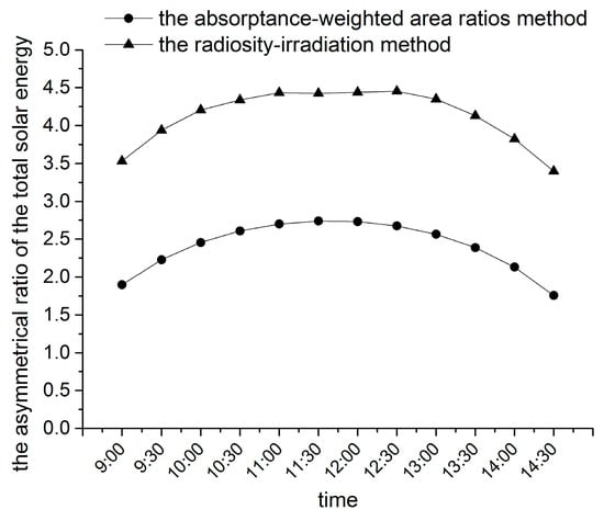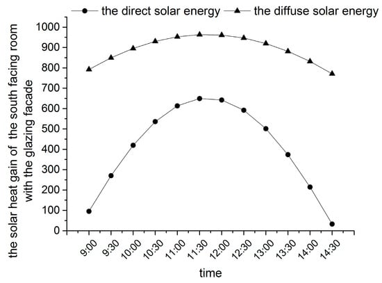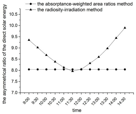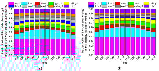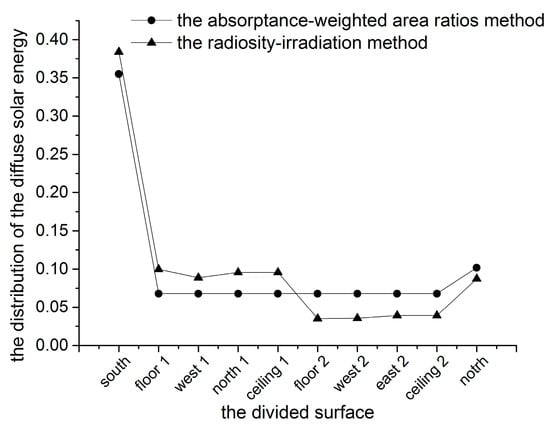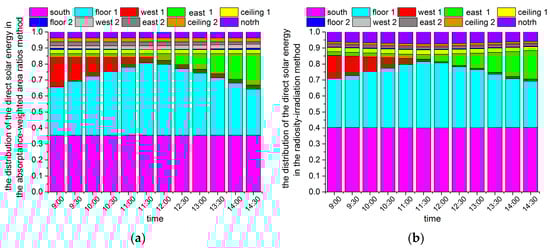 - The calculation results of the solar radiation distribution model used in EnergyPlus have significant errors too, as the distribution ratio of floor 1 is too large, and the distribution ratios of the other surfaces are relatively small. This is because it is assumed that all direct solar radiation falls to the ground after entering the room. The calculation results vary over time, and due to the constant distribution ratio of direct and diffuse solar radiation on each surface in the same room, the distribution of solar radiation on each surface is affected by the direct solar heat gain and the diffuse radiation heat gain.