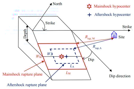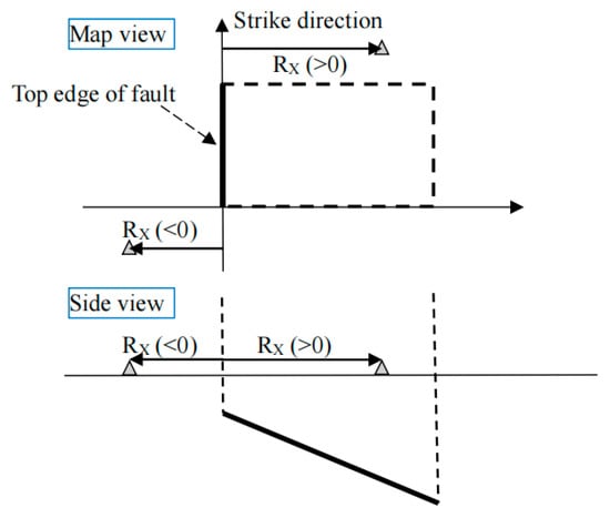 Figure 5 shows the schematic diagram of the rupture distance (Rrup) and Joyner–Boore distance (RJB). As shown in Figure 2 and Figure 3, Rrup, M and RJB, M are the rupture distance and Joyner–Boore distance of the mainshock, and Rrup, A and RJB, A are the rupture distance and Joyner–Boore distance of the aftershock. RX is the distance measured perpendicular to the fault strike from the surface projection of the up-dip edge of the fault plane, as shown in Figure 6 [36].