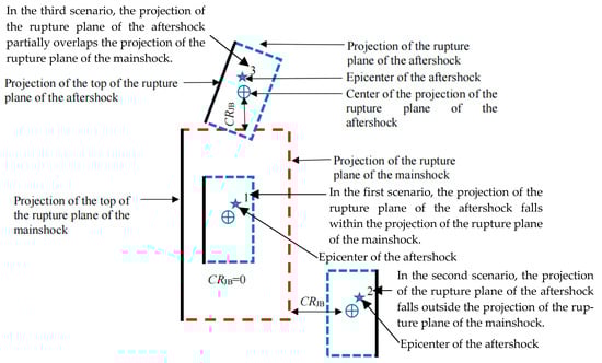 Figure 4 shows the definition of the centroid Joyner–Boore distance (CRJB), which is the closed distance between the centroid of the Joyner–Boore rupture surface of the aftershock and the closest point on the edge of the Joyner–Boore rupture surface of the mainshock [36]. CRJB is equal to zero under the assumption that the aftershocks occur on the same place as the mainshock or that the epicenters of the aftershocks are distributed uniformly along the rupture length of the fault of the mainshock. CRJB must be determined according to its definition only in the case that the epicenters of the aftershocks are assumed to occur around the epicenter of the mainshock uniformly.