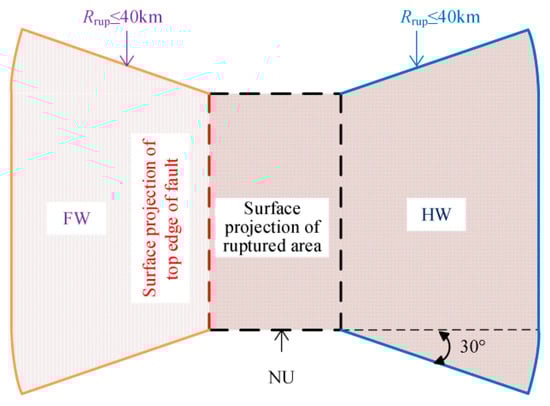 In this study, the site types of the aftershock ground motions are assumed to be the same as that of the mainshock ground motion. This means some parameters about the site model in the ASK14 model, such as the shear-wave velocity over the top 30 m (VS30), depth to VS = 1.0 km/s at the site (m) (Z1), etc., are assumed to be the same as the mainshock ground. As mentioned previously, three fault types are involved in the ASK14 model: (1) reverse, (2) normal, and (3) others. After the mainshock, determining which fault type of aftershocks is likely to happen is complicated and beyond the scope of this study. According to the research by Han et al. [37], these fault types are assumed to happen randomly and have equal probability. As for the parameters related to the hanging wall site, whether the site is within the hanging wall region is determined according to Figure 7 [36]. HW, FW, and NU mean that the site is within the hanging wall region, the footwall region, or the neutral region, respectively. Even if the site is within the hanging wall region, whether the hanging wall effect exists also relates to the fault type [38]. The hanging wall effect is assumed to exist for all fault types to simplify the procedure. If the site is located in the hanging wall region, the hanging wall effect is considered to exist.