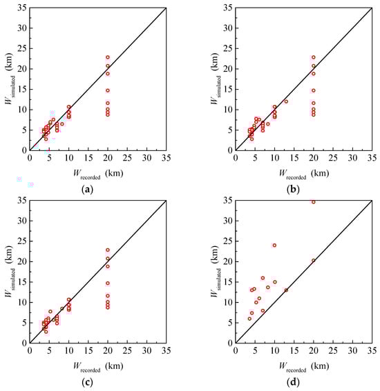 Figure 9 shows the down-dip rupture widths of the aftershocks with different assumptions, given the mainshocks. As shown in Figure 9, there are no essential distinctions between Figure 9a–c. The magnitudes of the aftershocks are equal to their actual values because only the magnitude and fault type are responsible for the down-dip rupture width. The only difference between them is the fault type of the aftershocks, which is simulated using the Monte Carlo method. Therefore, the subtle differences are caused by the different fault types of the aftershocks. The down-dip rupture widths of the aftershocks are assumed to be the same as that of the corresponding mainshock in Figure 9d. It can be found that the down-dip rupture width of the mainshocks is larger than those of their aftershocks, so the above assumption is not reasonable. A large magnitude usually leads to a large rupture because the magnitude of the mainshock is larger than those of its aftershocks.