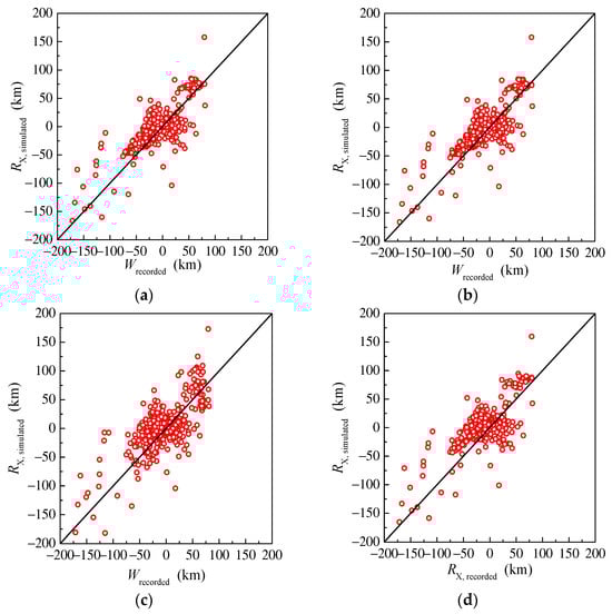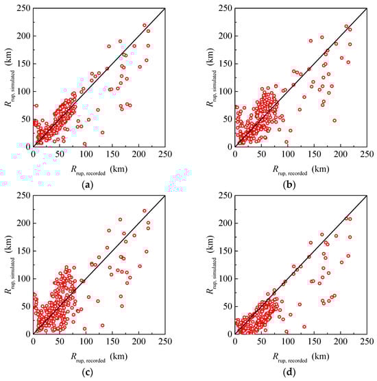 With the determination of the aftershock magnitudes, the other seismic parameters, such as the width of the rupture, the rupture distance, etc., are simulated with different assumptions about where the aftershock hypocenter will occur. Figure 19 shows the simulated rupture distances and their actual values for the reselected MS–AS ground motions. As shown in Figure 19a–c, the data dots are distributed uniformly on both sides of the 45° diagonal line. The data dots in Figure 19c are more dispersed than those in Figure 19a,b, in which the distribution of the data dots is similar. It still cannot give a reasonable result when the rupture of the aftershocks is assumed to be the same as that of the mainshock, as shown in Figure 19d. The results of the other simulated parameters are similar to those when the aftershock magnitude is known. Therefore, this paper does not provide all the details about the other simulated seismic parameters.