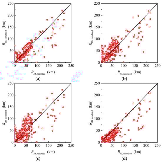 Figure 11 shows the Joyner–Boore distances of the aftershocks simulated under different assumptions. Overall, the results are consistent with those of the rupture distances of the aftershocks. Compared with the other assumptions, the first assumption has the best result. The results of the linear model and the circular model are similar. The result of the fourth assumption is deeply unreasonable.