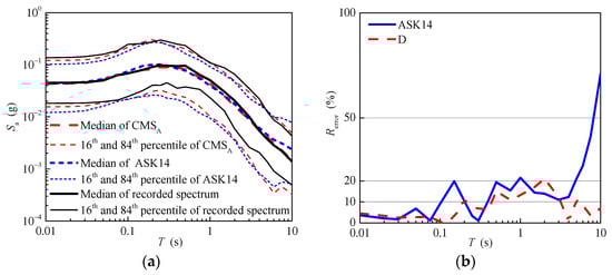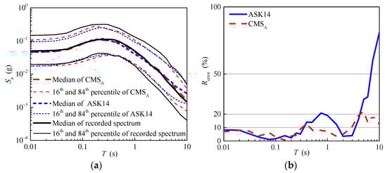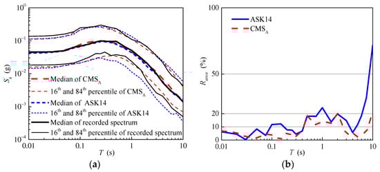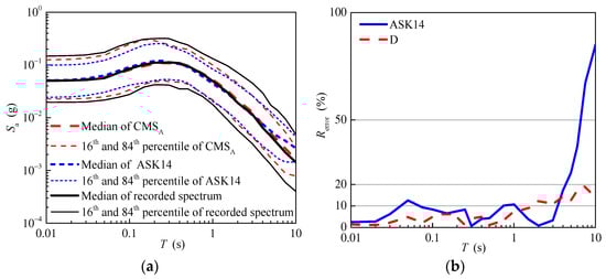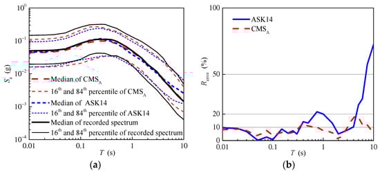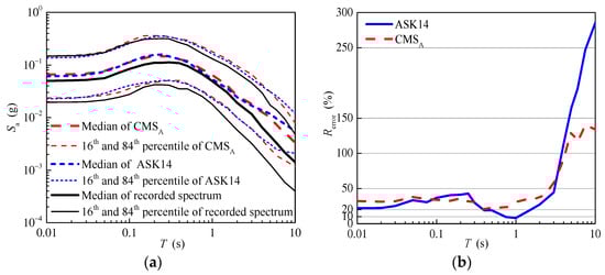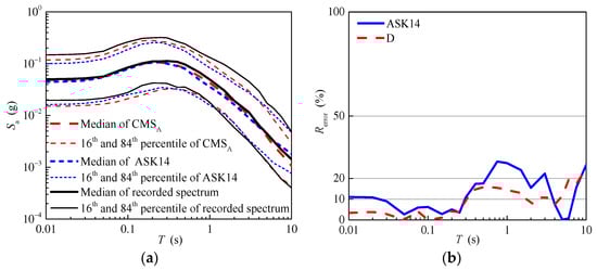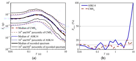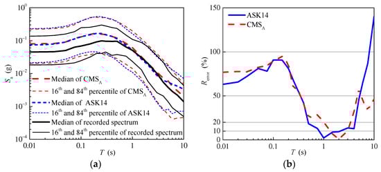 Figure 13b shows the relative errors of the median of the response spectrum predicted using the ASK14 model and the conditional mean spectrum of aftershocks. As shown in Figure 13b, the relative errors of the conditional mean spectrum of aftershocks are smaller than those of the response spectrum predicted using the ASK14 model in general. For the short and median periods, the relative errors of the conditional mean spectrum of aftershocks are nearly less than 10%, and range between 10% and 20% for the long periods. In contrast, the relative errors of the response spectrum predicted using the ASK14 model increase gradually, even reaching up to 70%.