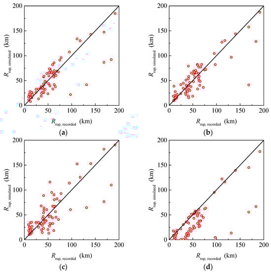 Figure 10 shows the simulated rupture distances of the aftershocks with different assumptions. When the aftershock hypocenters are simulated using the linear model or the circular model, the results are similar, and the data points are evenly distributed around the diagonal. Figure 10a shows that simulated data points are clustered around the diagonal, but most simulated results are smaller than the real ones. As shown in Figure 10d, almost all the data points are distributed below the diagonal, which means that the simulation results are far from the real situations. The real rupture distances of the aftershocks are greater than that of the mainshock in general. Therefore, the assumption that the rupture distances of the aftershock are equal to that of the mainshock is unreasonable.