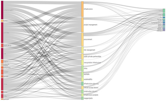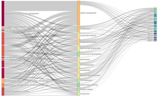 Three-plot Sankey graphs are presented in Figure 2 and Figure 3 to demonstrate the pivotal relationship between the research focuses across the analysed publications on CPD during the recent century. A line’s thickness indicates the degree of relationship between two variables [60]. Figure 2 depicts the relationship between “top authors”, “keywords”, and “publication source”. It should be noted that “top authors” refers to the first author in the publication mentioned in the figure. The analysis indicates that the “Journal of Construction Engineering and Management”, “International Journal of Project Management”, “Construction Management and Economics”, and “Journal of Management Engineering” were targeted by prolific authors to publish articles related to CPD research. These articles scrutinised different aspects of the research topic, such as Public–Private Partnership (PPP) performance as a CPD strategy, infrastructure planning, and risk assessment. As shown, “project management” was the most dominant keyword among top authors and journals. It may indicate that delivering construction programs requires effective project management due to a high failure rate. It may also show that urbanisation, population growth, and technological advancements have contributed to the interest in CPD research.