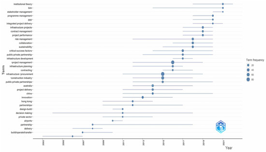 Figure 4 delineates the recent research trend topics in the domain of CPD contextualisation. It is discernible from the graph that, while construction program management has indeed been a subject of investigation in the construction industry, it has not been as frequently addressed by scholars as one might expect. In the recent past, however, researchers have demonstrated a growing interest in exploring specific areas within the domain, particularly those related to Building Information Modelling (BIM) stakeholder management, contract management, and the application of institutional theory framework in CPD, as pointed out by the arrows in the figure. This focus on these aspects is likely driven by the industry’s need to improve outcomes, minimise conflicts and disputes, and nurture better collaboration among stakeholders involved in CPDs. Intriguingly, the research trends suggest a cyclical pattern wherein most topics tend to decline in popularity after about five to six years. An exception to this observation is the Design–Build strategy, which has managed to maintain its relevance for more than a decade. The early 21st century saw Design–Build as a dominant procurement paradigm in academic investigations. However, the paradigm has progressively shifted towards more contemporary procurement approaches, such as public–private partnerships. Concluding this analysis, while “cost performance”, for instance, has been emphasised in the data, new trends are indeed beginning to gather momentum. Despite their relative novelty, these emerging topics highlight an industry-wide shift. This shift is oriented not only towards guaranteeing robust responses to unexpected circumstances, but also towards enhancing the management of the delivery phase of construction programs.