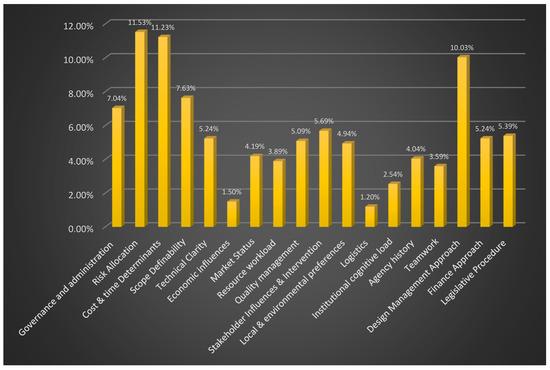 Moreover, the most cited attributes in research are regulatory ones, which comprise the nucleus of any construction delivery strategy, including governance and administration, design approach, risk allocation, cost and time determinants, legislative procedures, and finance approach. These principles govern construction contracts. The other attributes that convey normative or cultural–cognitive attributes follow the regulative attributes. The normative category includes those attributes that standardise all the processes resulting in construction program deliverables conveying scope definability, technical clarity, economic influences, market status, resource workload, quality management, stakeholder influences, local and environmental preferences, and logistic approach. They are either prescriptive or proscriptive action guidelines. However, they cannot necessarily be appraised legitimately. The impact of cultural–cognitive attributes is less known in selecting a CPD strategy than other attributes in research. They include the expectations, motivations, and understanding of stakeholders, as well as the norms and values that shape the decision-making process. Cultural–cognitive qualities, including teamwork, institutional cognitive load and agency history, may simultaneously be able to impact selecting a type of delivery, directly or indirectly, such as other attributes.