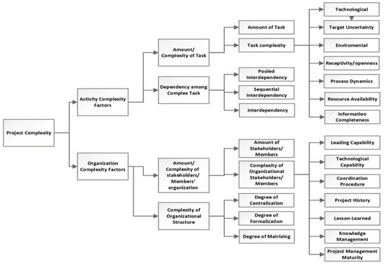 Construction programs have specific qualities in common. Any construction program is characterised by a high level of complexity [39]. Some scholars consider complexity a separate delivery attribute [42,81]; however, they have recently attempted to open up new managerial horizons to enhance an organisation’s ability in order to utilise capabilities and knowledge efficiently and explore strategies for reciprocating flexibly concerning the inherent complexity of CPD [29]. A structure was represented by [111] to find out complexity as an inherent part of any large-scale project by breaking it down (Figure 6). This tool allowed construction agencies and researchers to break down CPD complexity into smaller components and assign them different levels of complexity. The structure could address the hidden workload caused by complexity. As a result, the ancillary tool also gave users sensible foresight to efficiently plan the budget and schedule for a large-scale project by ascribing complexity to CPD attributes. The novel managerial paradigms developed by existing requirements have represented program management’s evolutionary components distinct from conventional project management values and principles.