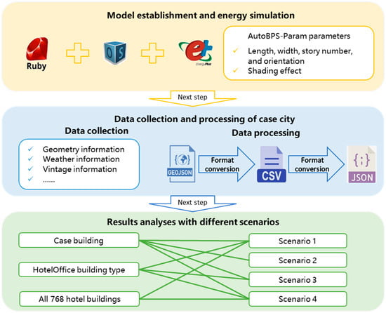 Figure 1 shows the research workflow of the paper. Firstly, the model establishment and energy simulation method via AutoBPS-Param was introduced. The method establishes the model according to the actual building information, including the length, width, story number, orientation, and the location and height of the surrounding buildings. The energy simulation introduced the non-geometric information required for simulation and the conversion process of the geometric model used for AutoBPS-Param. Secondly, the information collection and data processing for the case study city were described, including the geometry of the building, the climate information, and the built vintage information. The geometry information collected is in the Geographical JavaScript Object Notation (GeoJSON) format. The properties’ data are converted to Comma-Separated Values (CSV) and JavaScript Object Notation (JSON) for AutoBPS-Param. Finally, the results are analyzed for the case study city. The results are analyzed with three scales and four scenarios. The case-building scale analyzes Scenarios 1–4. The HotelOffice building-type scale explores Scenarios 1, 3, and 4. All building scales compare energy in Scenarios 1 and 4.