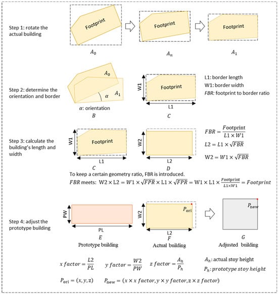 The fourth step is adjusting the prototype building based on the actual building’s equivalent length and width. The x factor, y factor, and z factor are calculated as in Equations (4)–(6):