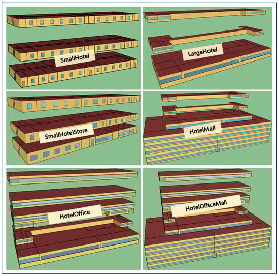 Changsha, China, was chosen as the case study city. Deng et al. [] identified six types of hotel-related buildings in three built vintages in Changsha: SmallHotel, LargeHotel, SmallHotelStore, HotelMall, HotelOffice, and HotelOfficeMall. Figure 4 shows the geometry of the six types of hotel-related buildings. Although the geometries were all rectangular, the zone multipliers were used to simplify similar zones into thermal zones to speed up the simulation process. The prototype buildings’ missing and blank stories have the same story thermal zone layout as the standard floor, which is not shown in Figure 4. The hotel vintage distribution of the six hotel types shows that most were built before 2005, followed by 2006–2014, and finally, post-2015.