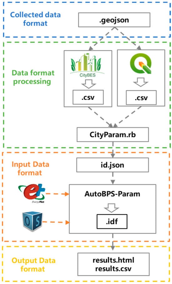 Figure 5 shows the data processing workflow from the acquired data format to the input JSON file format for AutoBPS-Param. The information obtained is in the GeoJSON format and covers the Changsha 68,583 building geometry information. GeoJSON [] is a geospatial data interchange format based on JSON. It defines several types of JSON objects and how they are combined to represent data about geographic features, properties, and spatial extents. The geometry type in the Changsha GeoJSON file is MultiPolygon and contains geometry objects and additional properties. Each building is assigned an ID stored in properties. The other properties in the GeoJSON file include the building type, the vintage, the footprint area to border ratio, and the orientation. The geometry in the GeoJSON file describes the geometry type and the MultiPolygon coordinates.