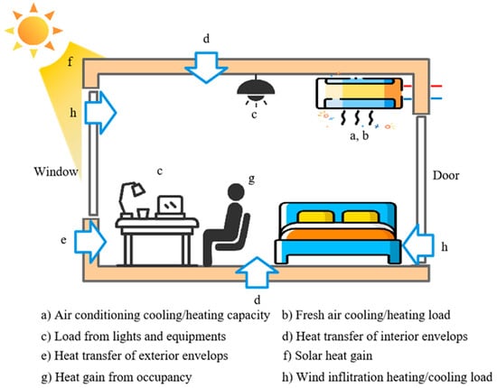 EnergyPlus is an energy analysis and thermal load simulation program developed and maintained by DOE that engineers, architects, and researchers use to model energy consumption—for heating, cooling, ventilation, lighting and plug and process loads—and building water use []. The heating/cooling loads in the room are shown in Figure 6. The load considerations for thermal zones include heat transfer through envelopes, solar heat gains, load from lighting and equipment systems, occupants’ heat load, fresh air heating/cooling load, and heating/cooling load due to door and window air infiltration.