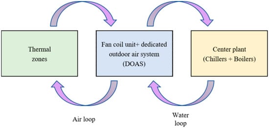 Figure 7 illustrates the coupling calculation between thermal zones, air loop systems, and central plant systems. The time step for room load calculation can be adjusted, with a minimum value of 1 min. Taking summer conditions as an example, EnergyPlus calculates the cooling load of each thermal zone based on the temperature setpoints. Various HVAC systems are available to meet the load demand, and the fan coil unit system is used as an example below to explain the load coupling calculation. After calculating the thermal load, EnergyPlus checks whether the output capacity of the fan coil unit can meet the cooling load requirements while the chiller regulates the water flow rate to the fan coil unit. If the load exceeds the chiller’s capacity, the room temperature will increase, prompting EnergyPlus to recalculate the room cooling load and adjust circulation. In cases where the chiller cannot supply the required chilled water, the chilled water outlet temperature will rise, and EnergyPlus will recalculate the water flow rate of the fan coil unit.