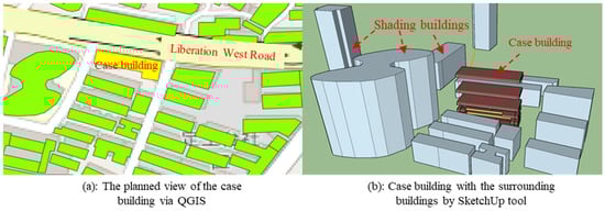 Table 6 shows the basic information of the case hotel building. The case study HotelOffice building is located in the downtown area of Changsha City, as shown in Figure 8. Figure 8a shows the planned view of the hotel’s location on the map via QGIS, while Figure 8b shows the geometry model of the case building with the surrounding buildings in the SketchUp tool. The geometric models of Figure 8a,b are slightly different, and the transformation process is introduced in Figure 3.