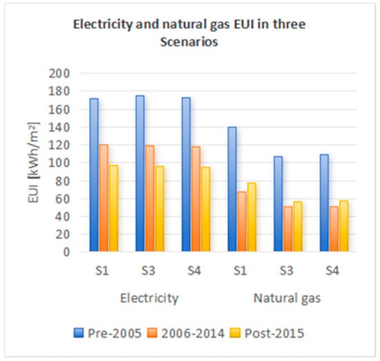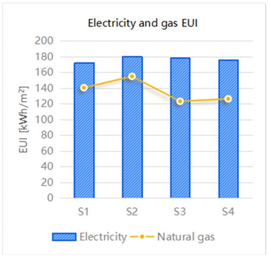 Electricity and natural gas EUI of four scenarios.