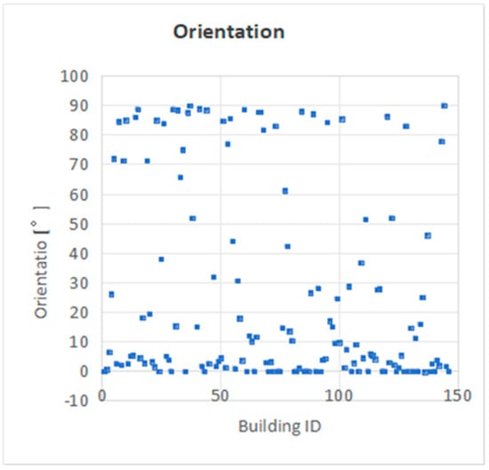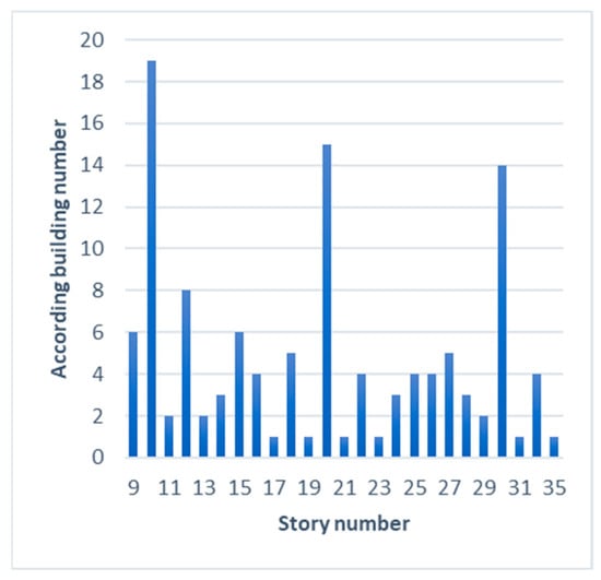 Figure 10, Figure 11 and Figure 12 show the 119 HotelOffice buildings’ geometry parameter distribution, including the number of stories, orientation, length (x factor) and width (y factor). Figure 10 shows that buildings with 10, 20, and 30 stories are the most common, with 19, 15, and 14 buildings, respectively. The orientation distribution of the 119 HotelOffice buildings is shown in Figure 11. The orientations of most buildings are close to 0° facing south or north. The distribution characteristics of building orientation align with the geographical features of southern China. Figure 12a,b shows the building geometry distribution. The median length and width of the HotelOffice buildings are 55.31 and 27.37 m. The length and width of the prototype HotelOffice building are 75.87 and 23.53 m; therefore, the median x factor and y factor are 0.73 and 1.16 according to Equations (4) and (5). The aspect ratio is the ratio of the building length to width.